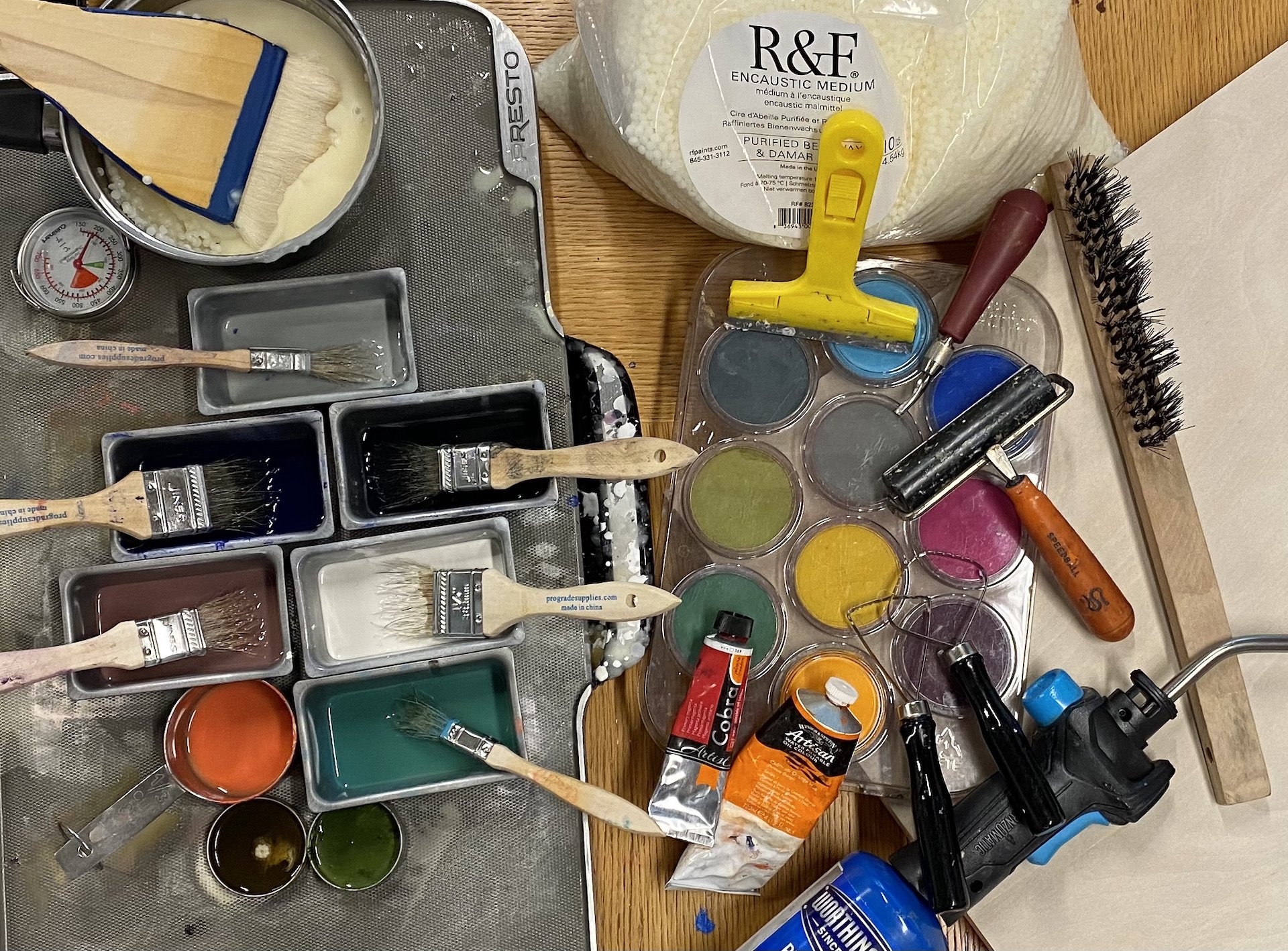 The earliest known encaustic paintings were from Egyptian mummy portraits, around 100–300 AD and the technique was common in ancient Greek and Roman painting. Encaustic techniques have been used throughout art history in many parts of the world. I love using this medium for its thick painterly characteristics. Beautiful colors and textures can be created with the medium. I also like using the viscous nature of the medium as a limitation to getting too detailed. I am able to create deeply colored, layered paintings that are focused on shape and line, enhanced texturally with other natural materials.